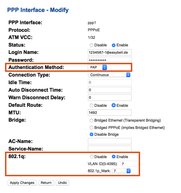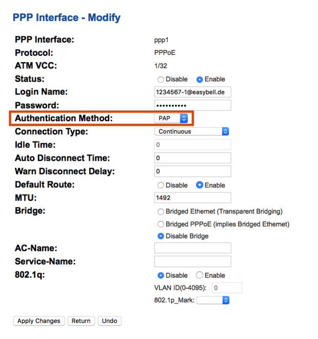 Now click on the small pencil at the bottom right under "Actions" behind the profile already stored to access the "PPP Interface - Modify" menu.