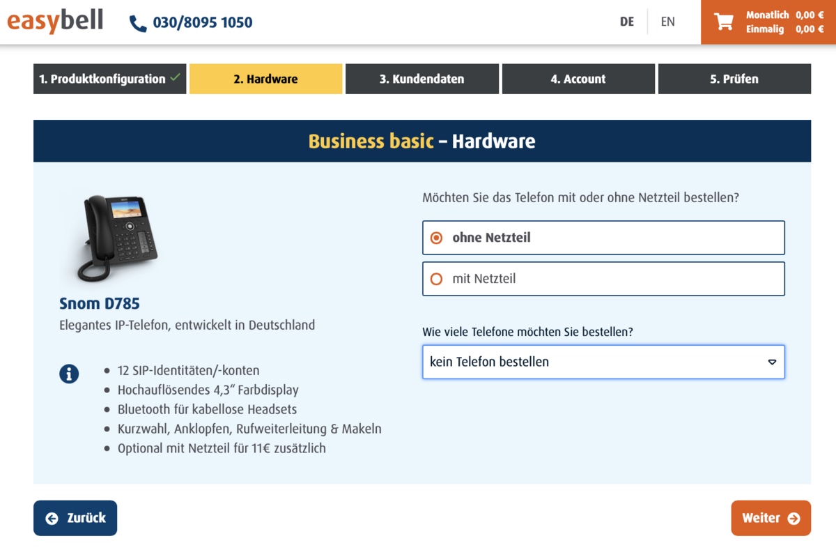 The shopping cart at the top of the screen shows you the monthly and one-off fees at all times so that you have full control. By clicking on the shopping cart, you will receive a detailed list of all product components and their costs.