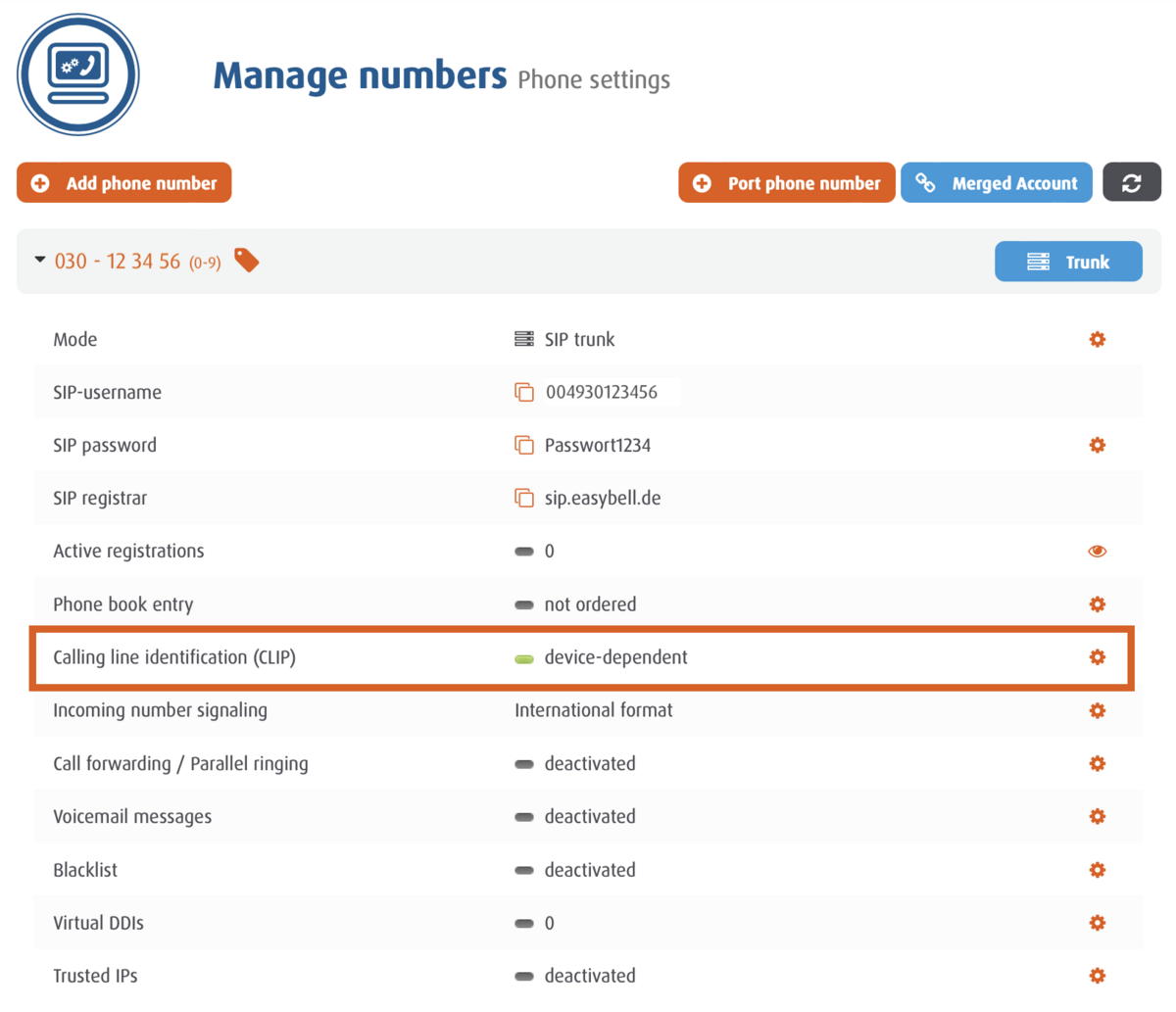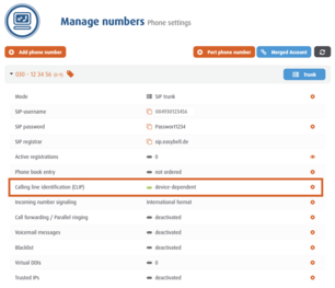 Open the desired trunk and click on the settings (gear icon) under the item "Calling line identification (CLIP)".