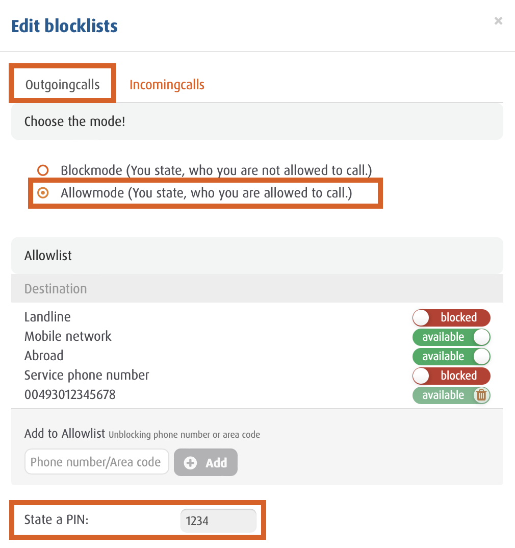 Function: The line is generally unblocked for outgoing calls. Only phone numbers or area codes you have defined cannot be called. A PIN can be used to bypass the block for individual calls.