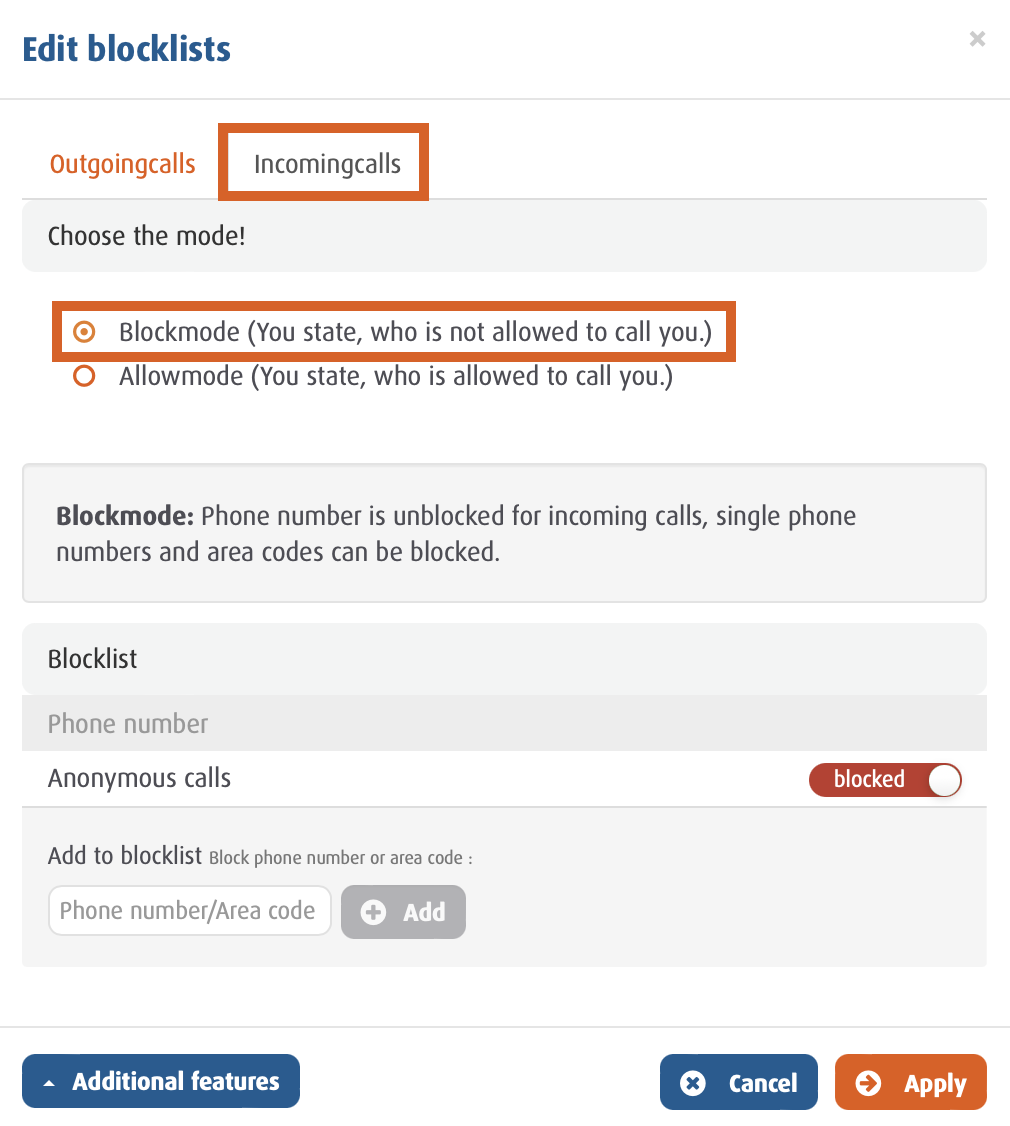 Any number of blocklists can be created for each phone number. Below you can see, among other things, how to create blocklists and the different options they offer.