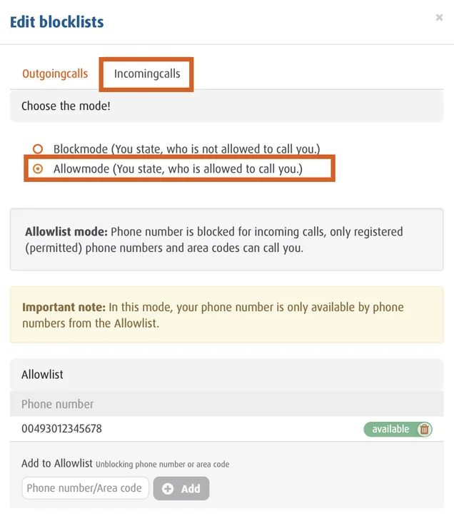 In allowmode, on the other hand, the SIP trunk is initially not accessible. Phone numbers or number ranges must be explicitly released.