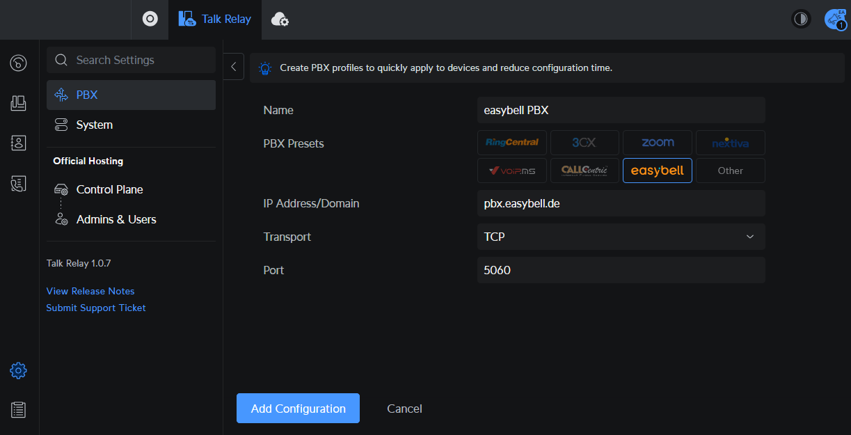 | PBX Presets: | easybell | easybell |