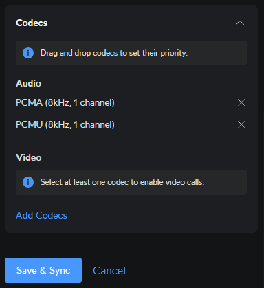 Scroll down further until you reach the codecs item. Deactivate all codecs except for PCMA and PCMU.