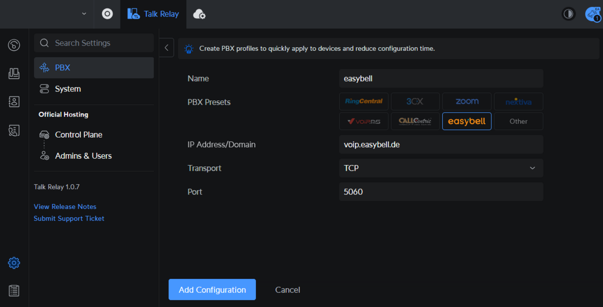 Click on the newly appeared Talk Relay icon at the top and then on "PBX". Fill in the fields accordingly - depending on whether you want to use an individual number or the Cloud PBX.